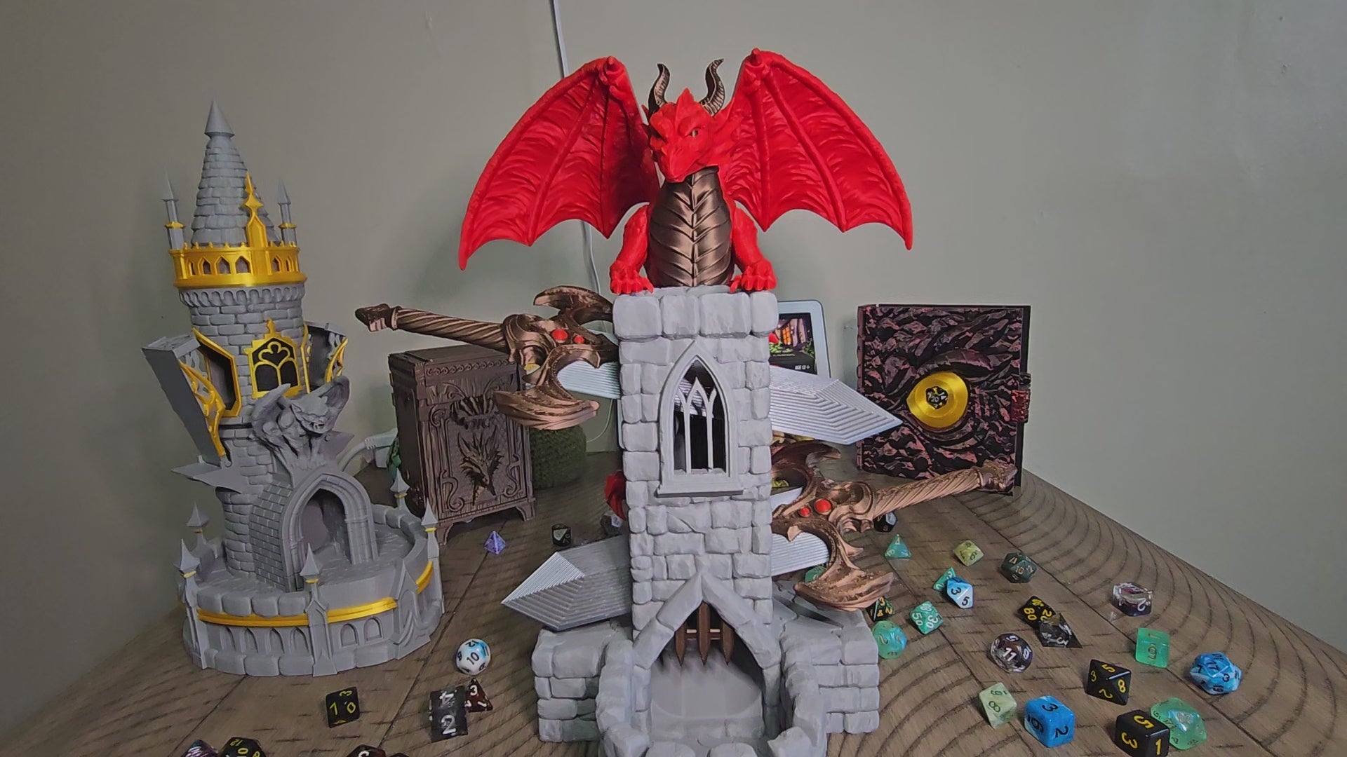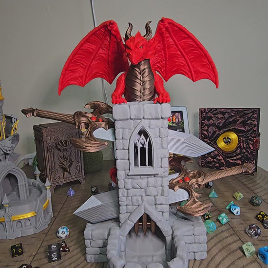 Introducing the ultimate gaming gadget—a fantastical 3D-printed Dragon Watch Tower that's equal parts showstopper and mechanical marvel. Draw the Swords from the dragon's grip and trigger a cascade of rolling dice that'll have everyone at the table grinning. This playful contraption blends imagination with ingenious engineering, turning every roll into a mini-adventure.