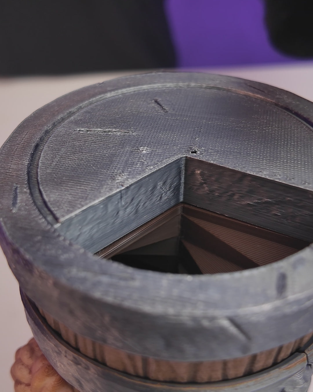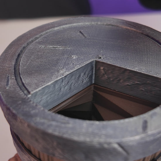 Roll the dice and let destiny decide with Keg of Fate! This charming 3d printed tavern barrel brings a touch of medieval magic to your game night. Put your dice in the open top, twist the bottom open to reveal a hidden compartment that releases your dice onto the table. Perfect for dungeon masters, tabletop enthusiasts, and anyone who loves a bit of theatrical flair. Watch your friends' faces light up as you dramatically unveil your next roll from this whimsical wooden vessel. A conversation starter that doubles as functional storage for your most treasured polyhedral companions.